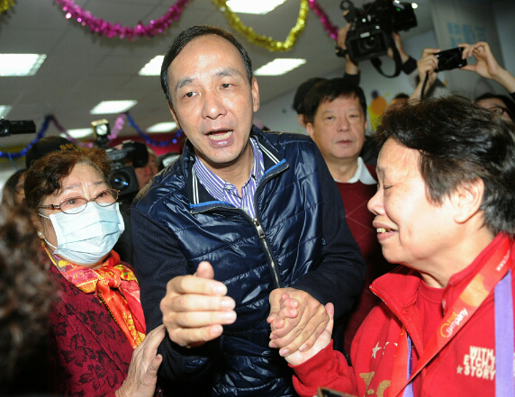 图:17日上午,朱立伦在竞选总部会见支持者,并与他们逐一握手表示感谢/中通社