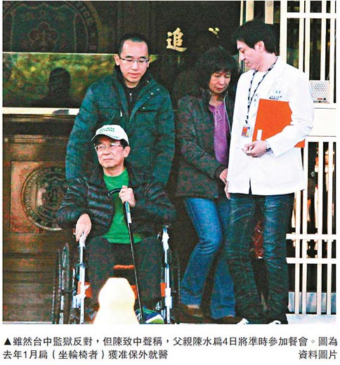 陈水扁于2000年至2008年担任台湾地区领导人,任内爆发多起贪腐弊案。2008年5月卸任后即因涉嫌公务机要费贪污、洗钱等重罪被收押,后因龙潭购地弊案、陈敏薰卖官案受贿、元大金并购复华金受贿等案,被合并判刑有期徒刑20年。2013年4月扁因被诊断出重度忧郁症、非典型柏金逊症、大脑轻微萎缩而被移送至台中监狱培德医院疗养。但当时在野的民进党并未因此善罢甘休,要求国民党政府特赦扁或让扁保外就医。在民进党的强大压力之下,国民党政府于去年1月同意扁保外就医,虽然限期为1个月,但若身体情况不好,可延长1至3个月,不限次数,等于给了扁“免回金牌”。扁现已获6次延期,下次至8月到期。