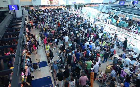 图:25日下午,虽然华航班机陆续起飞,但桃园机场华航柜台依旧人潮满满/中央社
