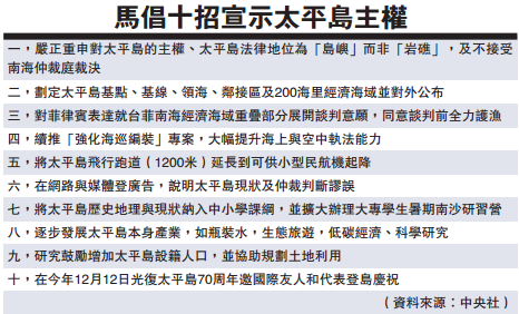 马英九表示,仲裁庭作出降格判断,令人错愕与震惊。台湾不分朝野蓝绿,一致拒绝接受判断。展望未来,挑战极多。台“总统府”已表示,未来不排除蔡英文亲往太平岛,他谨提出10项具体建议(详见另表),供蔡英文登岛时参采。