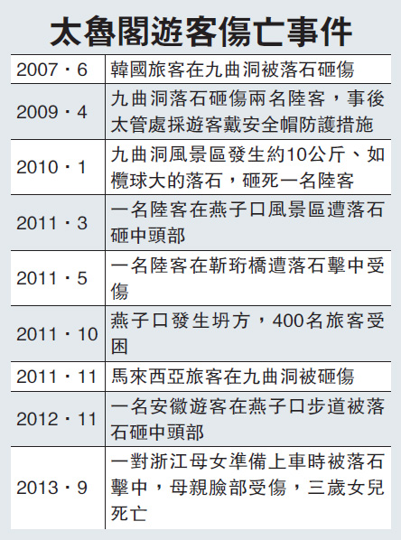 太鲁阁虽以独特的地貌闻名于世,却也潜藏落石伤人的危险。由于峡谷两旁山脉上层的巖石易受风化剥落,当颱风、地震来临或连日降雨时,就容易出现崩塌或落石。