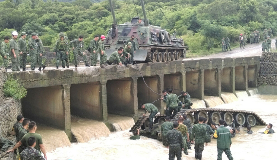 图:台陆军十六日早上在屏东进行联勇操演实弹测考,一辆战车翻覆坠入网纱溪,军方进行救援/中央社