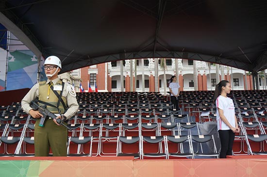 图:“双十”庆典即将到来,9日庆典场地准备工作已大致完成,宪兵与维安人员在现场确保进出人员的身份\中央社