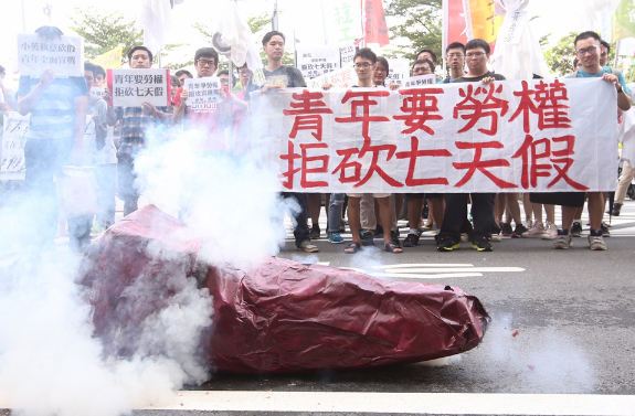 高教工会青年行动委员会、反教育商品化联盟等52个学生会、青年团体、工会24日一早聚集在“立法院”大门,发动“青年争劳权,围攻资进党”游行,众人高喊“青年要劳权,拒砍七天假”等口号,表达七天假是攸关学生与青年打工族的重要权益。