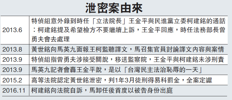 这场备受瞩目的官司背后,是引爆国民党近年来最大党内派系冲突的“马王政争”。2013年6月,特侦组因其他案件监听柯建铭,意外录到时任“立法院长”的王金平、时任法务部长曾勇夫涉及为柯建铭关说司法案件。黄世铭在获得监听译文后,立即向马英九报告此案,交付通话译文与相关证词。