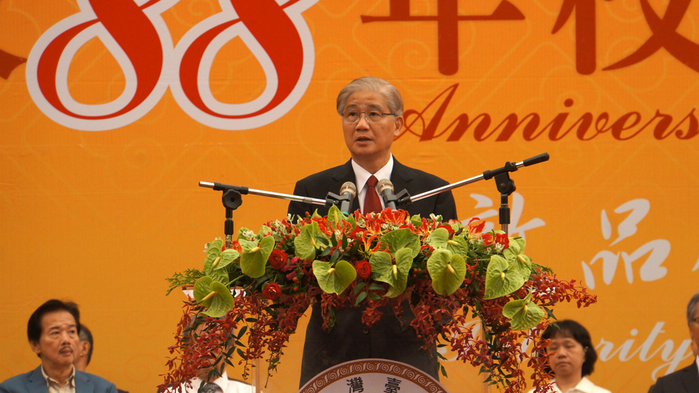 图:台大校长杨泮池捲入论文造假丑闻。图为他15日在台湾大学创校88年校庆庆祝大会上演讲/中央社