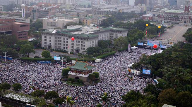 台北有逾10万人身穿白衣,聚集蔡英文办公室前凯达格兰大道陈情。(图片来源:台湾《中时电子报》)