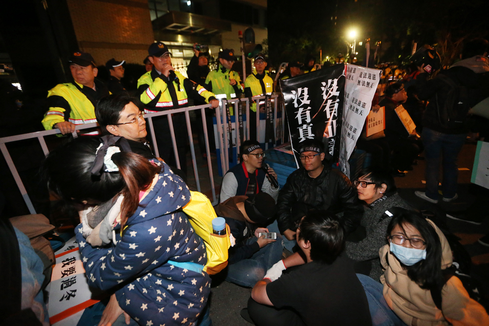 图:国民党党工自救会16日在党产会大门外,抗议党产会冻结国民党资产,导致党工领不到薪水,并聚集在门外不肯离去/中央社
