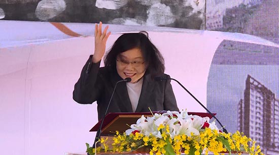 图:蔡英文19日在桃园出席桃园市府主办的“桃园区中路二号社会住宅开工典礼”时,头被背后看板砸到,所幸无大碍/中央社