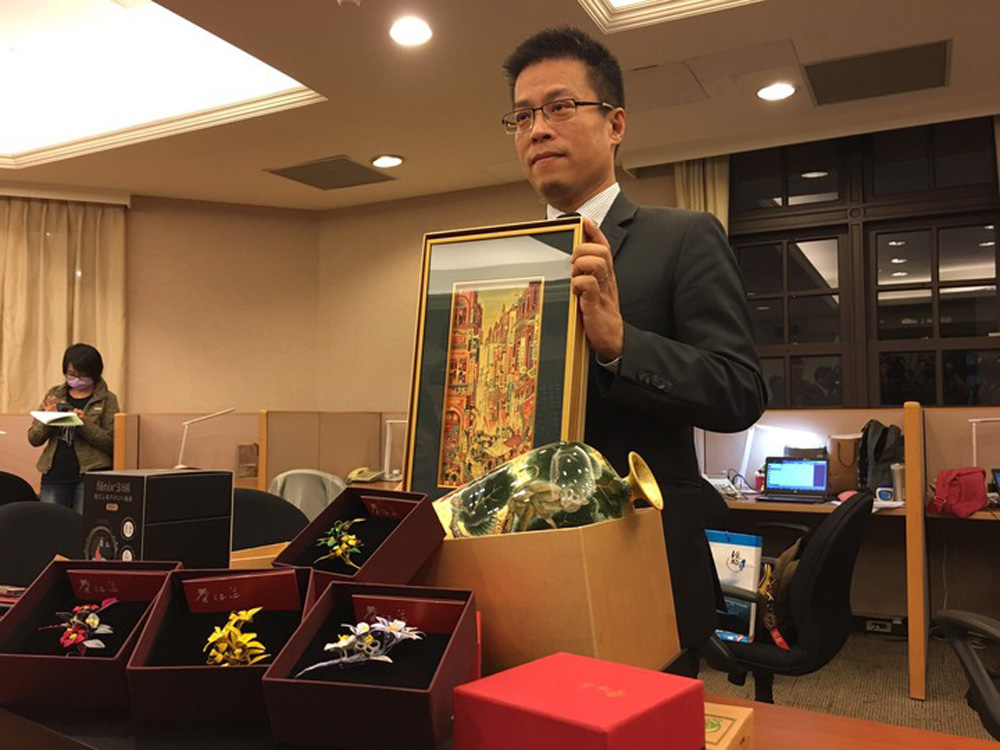 图:蔡政府发言人黄重谚展示将赠送四国元首的礼物/网络图片