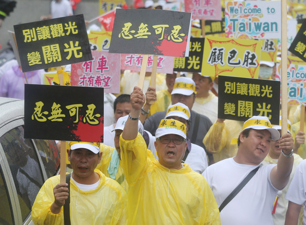 图:民进党当局去年五月上台后,陆客大减,影响岛内旅游业生计。去年九月台湾观光产业上街抗议当局无法处理两岸关系/资料图片