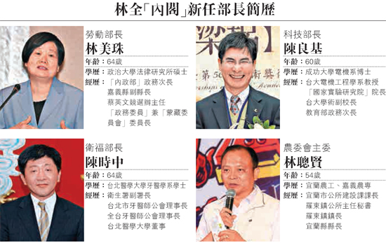 大公网2月4日讯 台湾“行政院”发言人徐国勇3日傍晚公布“内阁”改组名单,内定新任农委会主委林聪贤、卫生福利部长陈时中、劳动部长林美珠、科技部长陈良基。国民党称,此次更换少数“阁员”只是换汤不换药,最应为施政不佳下台负责的是“阁揆”林全。而蔡英文亲表姐林美珠执掌劳动部更被批评指用人唯亲,“选人不选才”。
