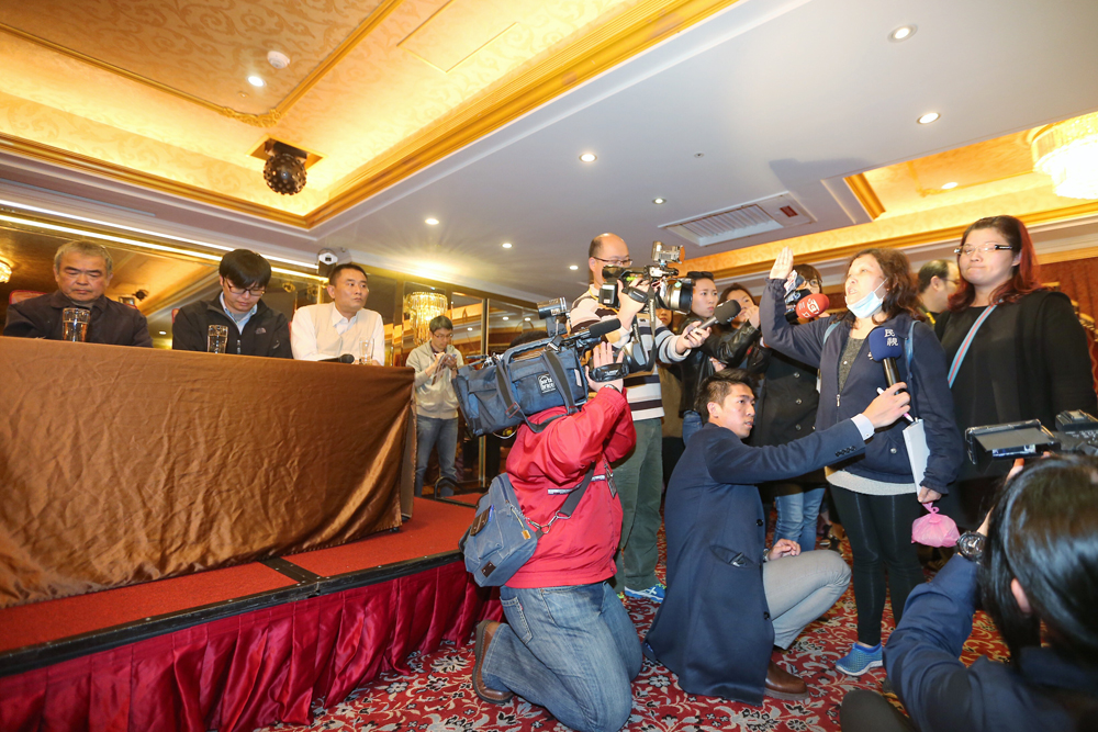 图:蝶恋花旅行社创办人、负责人周比苍和周继弘(左一、二)父子17日与死亡司机康育薰的妻子(右一)与导游萧如进的妻子(右二)在记者会现场对质/中央社