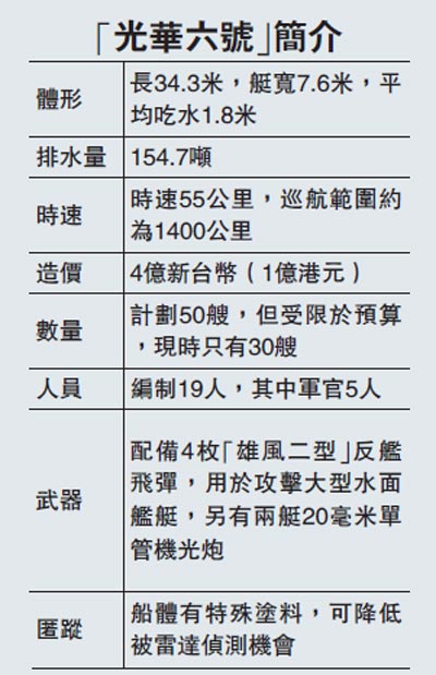 据说,编号为FACG-78的“光华六号”飞弹快艇造价4亿新台币,配备4枚“雄风二型”反舰飞弹,可直接攻击距离150公里的大陆军舰,现时为台军重要战力。值得关注的是,“光华六号”船体有特殊涂料,可降低被雷达侦测机会。