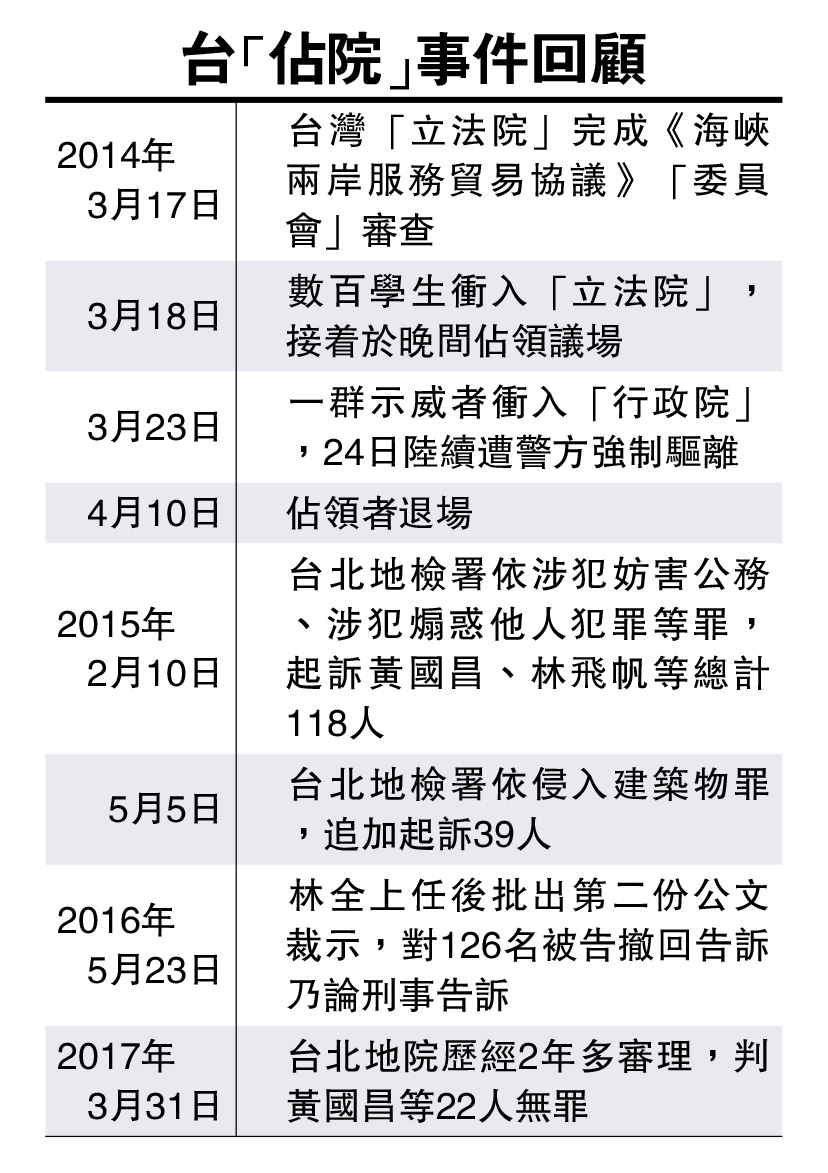 不过,历经2年多的审讯,台北地方法院31日审结却宣判林飞帆、陈为廷和黄国昌等22人全部无罪。