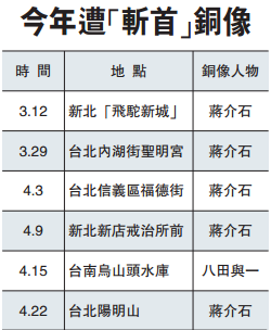 综合台媒报道:民进党当局去年5月20日后上台后,通过“去孙化”、“去蒋化”,大搞“文化台独”。在当局的纵容之下,岛内各地多个蒋介石铜像遭到破坏,甚至被砍首,民进党籍台南市长赖清德甚至下令拆除市内所有蒋像。当局的野蛮行径引起泛蓝人士强烈不满。本月中旬统派人士李承龙承认破坏八田与一铜像。尔后,“独派”团体为了报复,日前砍掉阳明山上的一座蒋像的首级,并在网上承认犯案,留言“向台湾水利之父八田君献祭,以慰在天之灵”,还指出“你敢砍我一个,我就砍你无数个!”