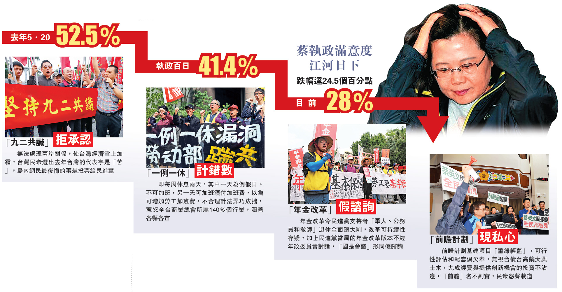 首先,当民众被问到“蔡英文就任将满1周年,请问您对她的施政表现满不满意?”有28%表示满意,54.3%不满意,17.8%无表态。蔡的满意度从去年520的52.5%、执政百日的41.4%,降到现在仅剩28%,1年内下跌24.5个百分点;不满意度部分从去年520的5.9%、就职百日的40.4%,至现在已冲破5成,升辐为48.4个百分点。从政党倾向进行交叉分析,在中立选民部分,不满意蔡英文表现的比例为51.3%,22.4%满意;在绿营支持者部分,满意比例仅61.6%勉强及格。