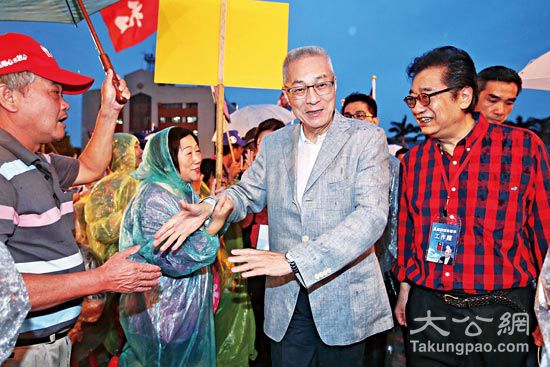 吴敦义(右二)在造势大会上与支持者握手致意。资料图