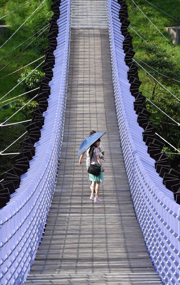 图:民众顶着大太阳漫步在台北市白石湖吊桥\中央社
