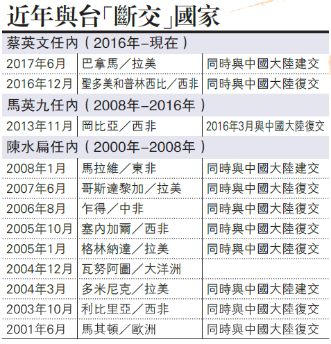 另外,巴雷拉在今年4月12日宣布巴国驻台“大使”马缔斯返国接任社会保险局局长后,便一直没有宣布新任驻台“大使”人选,而台当局派赴巴拿马接任“大使”的曹立杰至今未能呈递到任国书,加上巴拿马除了连续3年未在联合国大会总辩论为台发声,今年也未提案助台湾出席世界卫生大会(WHA),已见台巴“断交”端倪。