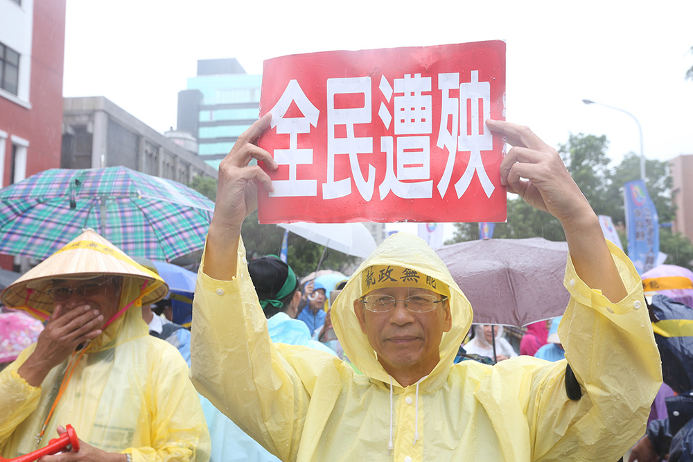 台湾当局领导人蔡英文上台一年施政不佳,亦因不承认“九二共识”导致两岸关系恶化,内外交困。图为15日反年改团体在台“立法院”外抗议当局强推年金改革,民众高举“全民遭殃”标语/中央社