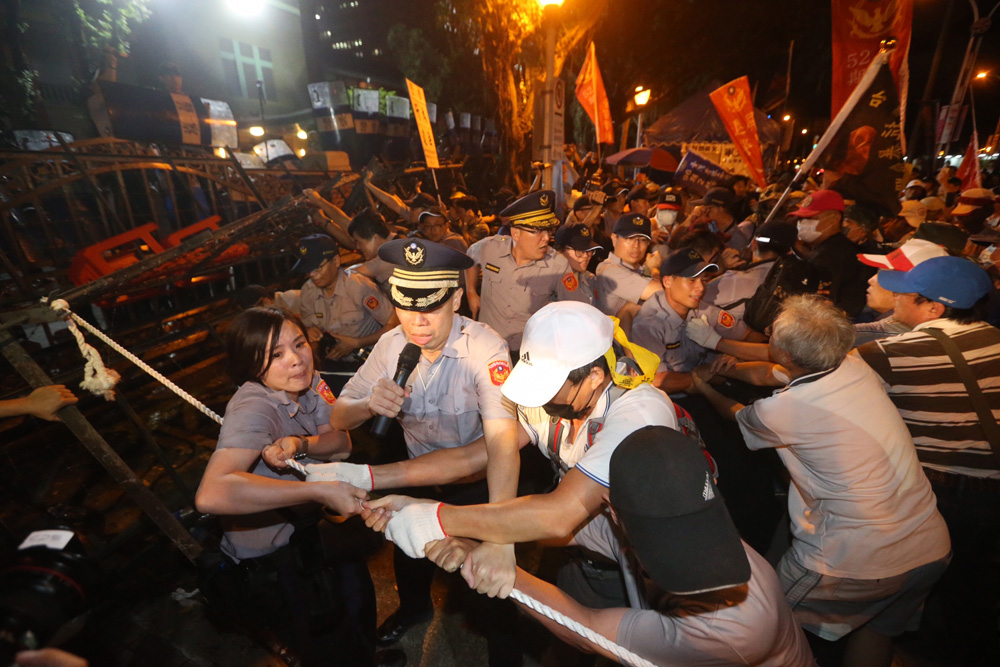 当晚反年改群众在“立法院”大门外,施放烟雾弹以及沖天炮,更用粗绳索绑住马,试图将铁马拉开,警方在立院内及铁马前与民众僵持,并阻挡群众丢出的宝特瓶等物品。为了阻止警方调配人力,反年改群众也分工合作、挡住警方出入口,不让警方前进。