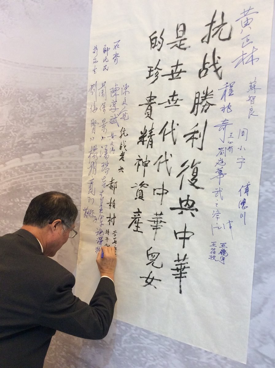 两岸退役将领在郝柏村的书法作品上签名 记者陈旻摄影