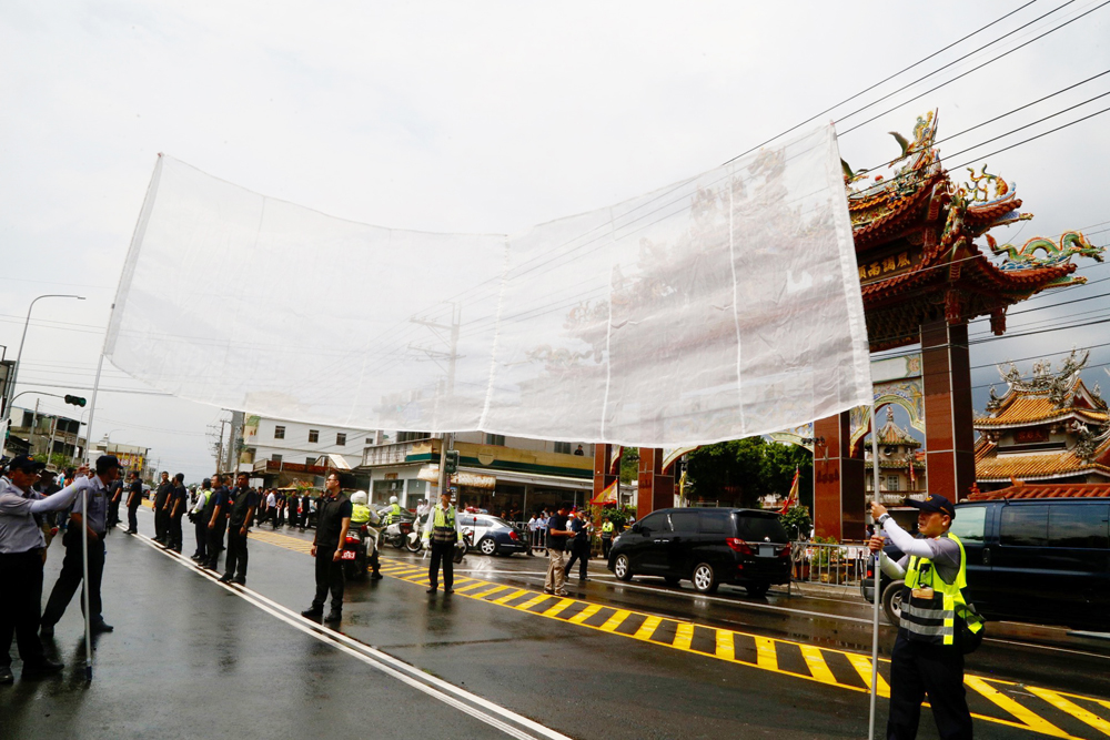 图:蔡英文6日在高雄参访时,警方拉起防护网阻挡民众丢物抗议”中央社