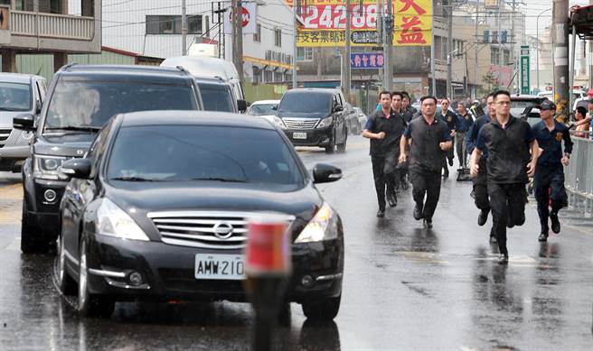 蔡英文6日南下高雄燕巢天后宫参拜,遭到军公教人士群聚抗议,车队抵达现场时维安人员跑在车队旁戒护。(图片来源:台湾“中时电子报”)