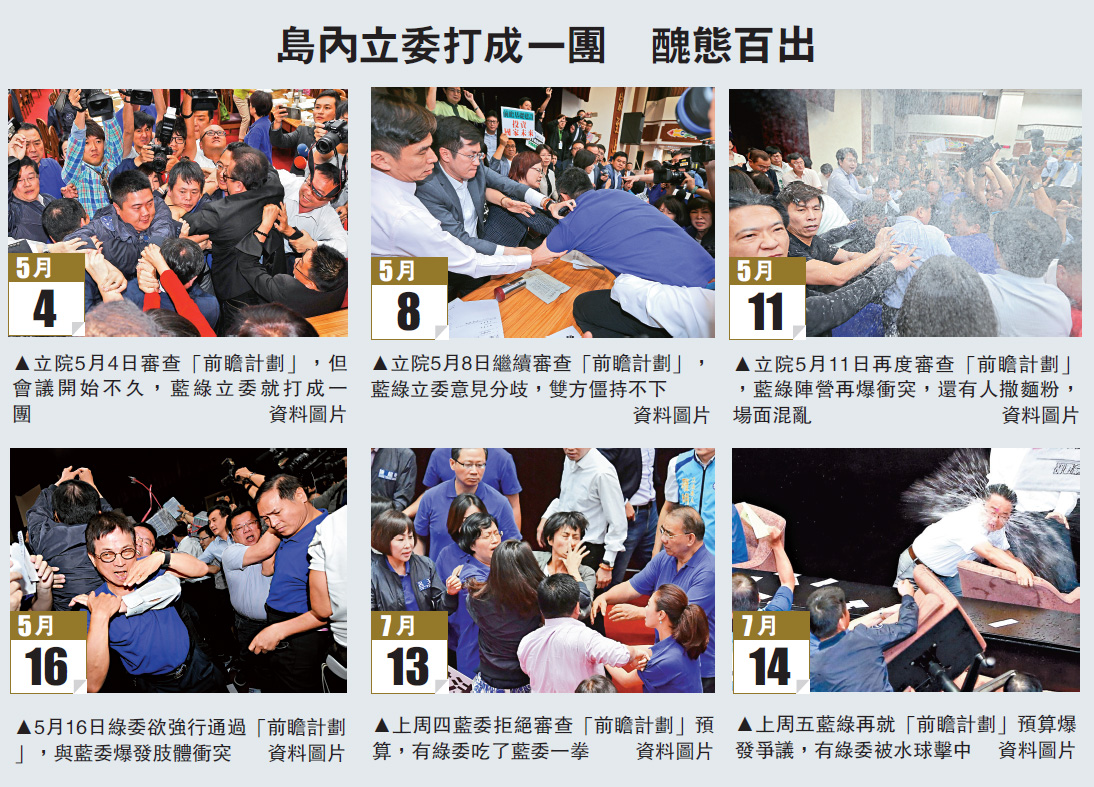 【摘要】岛内“立法院”近日审查“前瞻计划”预算案,国民党立委不满民进党立委早前以人数优势强行通过“前瞻计划”,于是杯葛预算案,双方在“立法院”大打出手,丑态百出:搧耳光、丢水球、砸椅子。对于这些劣行,在美国著名媒体看来,台湾地区立委的议事水准和肯尼亚、尼日利亚、索马里等“第三世界”无异。