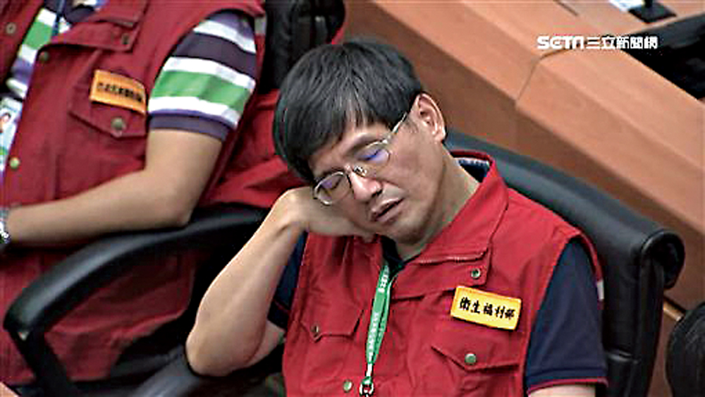 综合台媒及中通社报道:蔡英文及“行政院长”林全日前皆赴“纳沙台风中央灾害应变中心”视察,听取灾防中心报告,其他部会首长也没能闲着,都要到场并向蔡英文报告最新情况,也便于跨部会间进行整合沟通和快速决策。不料,当天台上的蔡英文在简报台风情况,“卫福部”、“交通部”官员呼呼大睡:“卫福部”官员睡到嘴巴都打开了,一听到关键字“报告完毕”,才立马醒过来。“交通部”女官员则手臂交叉胸前,也睡得好香甜。