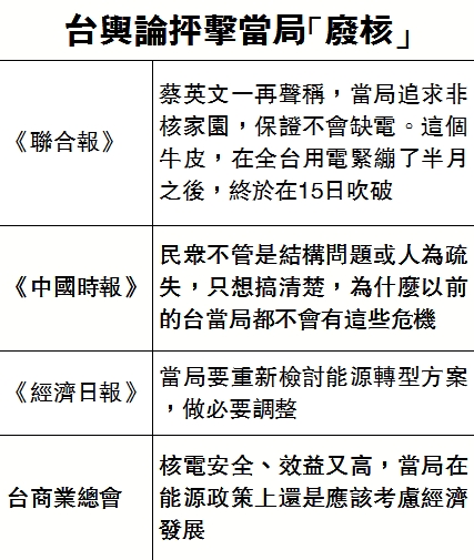 台湾《联合报》的评论则说,蔡英文一再吹嘘的非核家园、保证不会缺电的“牛皮”,在全台用电紧绷了半月之后,终于“吹破”。蔡英文的能源转型政策举世无双,既可以保障供电无虞,又可以保证电价不涨,还不会有碳排放超标的空气污染问题,而这些保证连德国与日本都办不到。