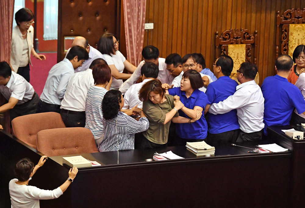 蓝绿立委在立院打架的次数不胜枚举。民进党在野时曾佔领立院议会主席台,以求阻挡核四“公投”案。而到了2016年4月29日,国民党党团因“课纲微调案”,史上首次佔领台立法机构主席台。今年民进党团力推的“前瞻计划”由于耗费巨大、争议颇多,台立法机构内围绕此事的斗争绵延不绝。5月份台立法机构的会议上,民进党团以人墙护卫主席台,部署战斗位置。国民党团则出新招,除哨子、汽笛喇叭干扰议事外,又向主席台撒麵粉,不少绿委被搞得“灰头土脸”;7月开会再议时,蓝委特地准备了上千颗水球,用黑色手提袋装好后放在会议桌下,“文攻”无效后祭出“水球攻势”,有水球扔到天花板,被击中的天花板灯罩几乎快掉下来,绿委只得穿雨衣反制。