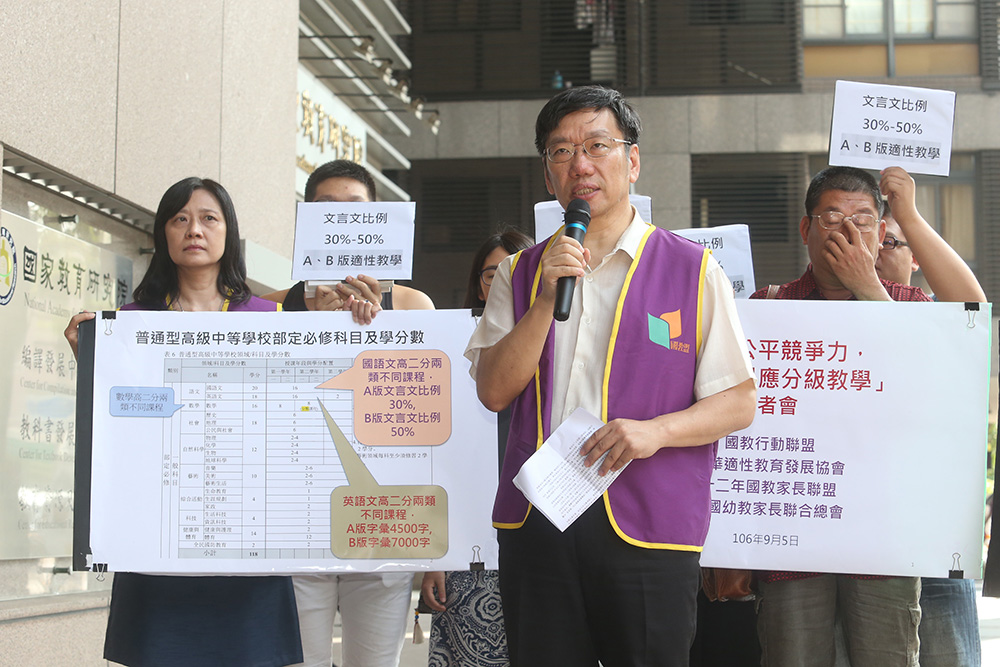 国教行动联盟、国教家长联盟等团体一早到会场外举标语,诉求将国文分成A、B版教学,文言文比例订在30%至50%之间,让学生适性学习。课审会代表、教师工会总联合会秘书长李雅菁受访表示,希望课纲讨论可以回到教育的初衷,必须让学生愿意学习。
