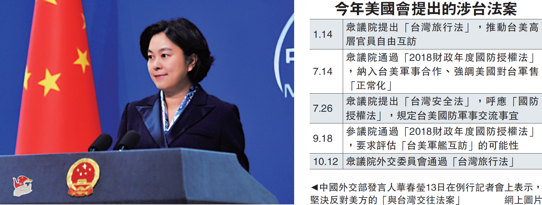 图:中国外交部发言人华春莹13日在例行记者会上表示,坚决反对美方的“与台湾交往法案”/网上图片