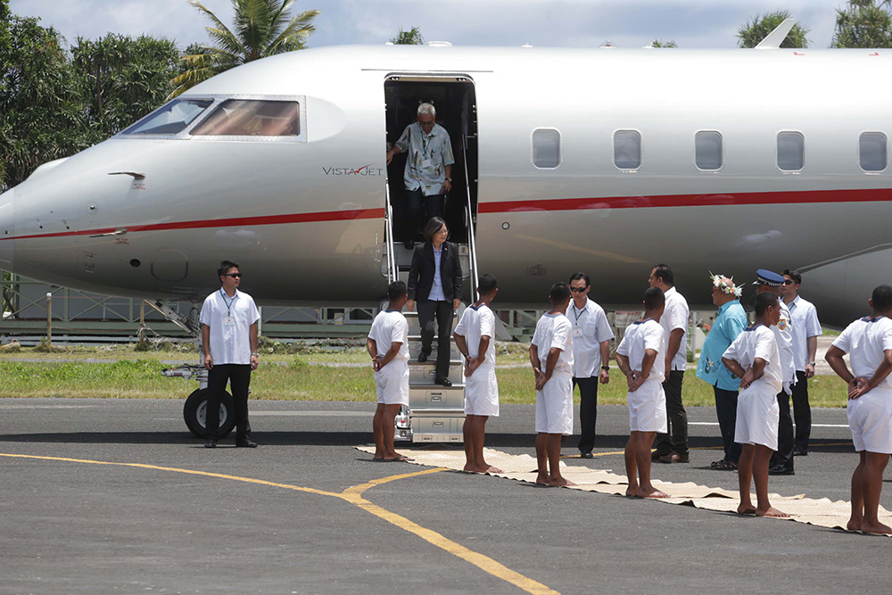 图:台湾当局领导人蔡英文出访期间,1日乘搭高档商务包机庞巴迪环球6000到达太平洋“友邦”图瓦卢,被质疑奢华享受却要全民买单\中央社