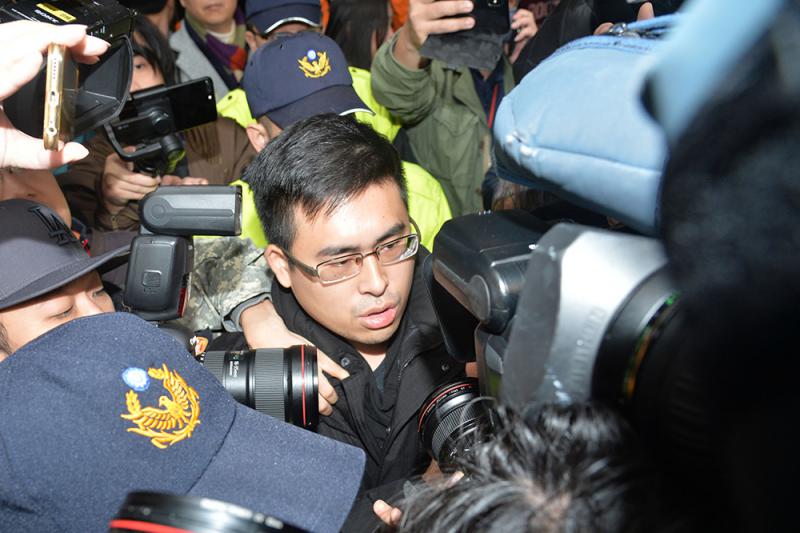 图:检调十九日到新党发言人王炳忠的住处搜索。王炳忠(中)被调查局人员带出台北市万华的住处/中央社