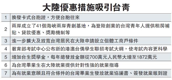 岛内中国文化大学教授钮则勋表示,大陆便利政策给台湾年轻人就业创业提供了友善环境,相较之下,蔡政府根本没有办法有效解决台湾年轻人低薪或者被社会弱化的问题。只要大陆继续坚持不懈地对台湾民众祭出优惠政策,就会争取到越来越多台湾青年的认同,让台湾社会的“中国认同”比例回升。