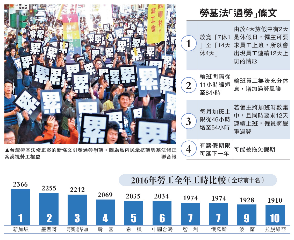 图:台湾劳基法修正案的新条文引发过劳争议。图为岛内民众抗议劳基法修正案漠视劳工权益/联合报