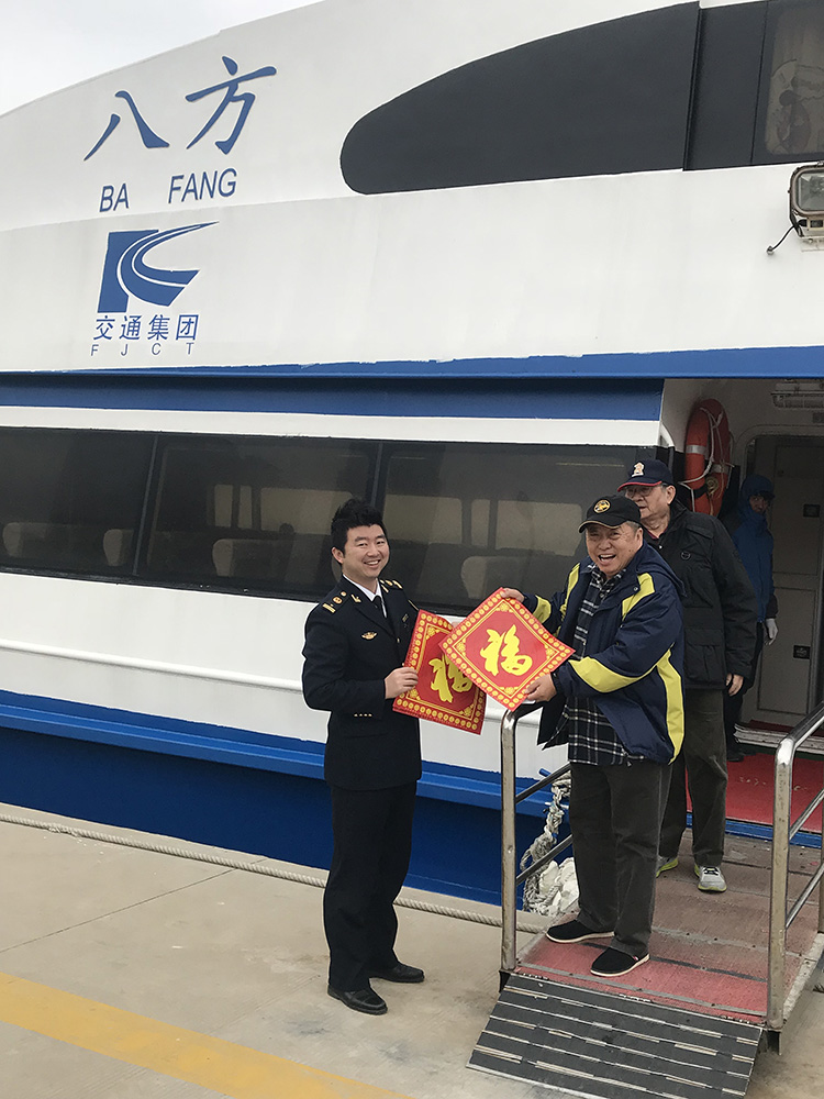 泉金航线海事处执法人员在春运第一天,特意为即将出港的“八方”轮及台胞送去精心准备的福字和春联,提前送去新春的问候。泉金线每天正常运营10个班次,大年三十及初一部分班次停航,其他航班正常,初二起航班恢復运营。厦金航线每天往返36个航班。据厦门五通码头负责人介绍,除2月15日(除夕)下午提早下班外,其他航班及开航时间均不变。