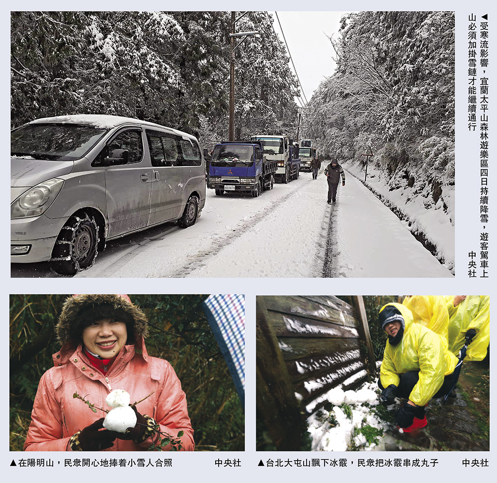 大公报2月5日讯 全台急冻。入冬最强寒流从3日起影响台湾,预计一直到7日清晨寒流都将笼罩全台,西半部及东北部低温下探7度,将是14年来台湾持续最长的寒流。合欢山、玉山、太平山等地都下雪,涌入赏雪车潮,车子打滑事故不断。警方3天来在冰天雪地,协助上百辆车脱困。此外,从2日至4日,全台有超过70人疑因低温导致死亡或猝死。