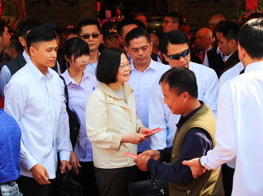 16日下午,蔡英文来到台南台湾首庙天坛参拜,发红包的过程中有3名陈抗者混在队伍中,高喊“政府无能,小英下台”,三人被保安人员拉走。蔡英文大年初三到访嘉义市时,在警方安排下数十名身穿白衣的保安围在她身边,此外还有许多警员等穿便服,穿梭、隐身在排队人潮中,最初经过蔡英文面前也领福袋,之后则不再领转身离开。