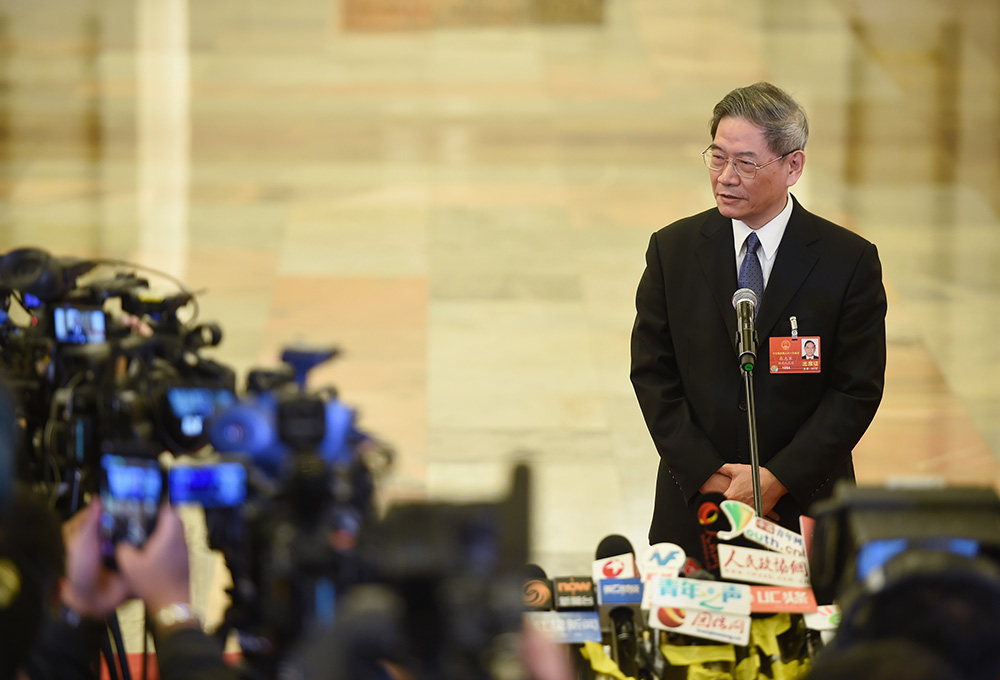 图:国务院台办主任张志军5日在十三届全国人大一次会议的“部长通道”上接受媒体採访/中新社