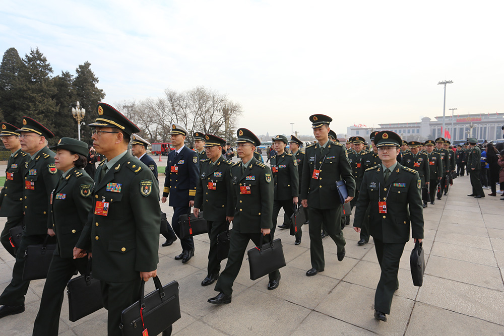 图:十三届全国人大一次会议5日上午在北京人民大会堂开幕。图为解放军和武警部队代表步入会场 /大公报记者何嘉骏摄
