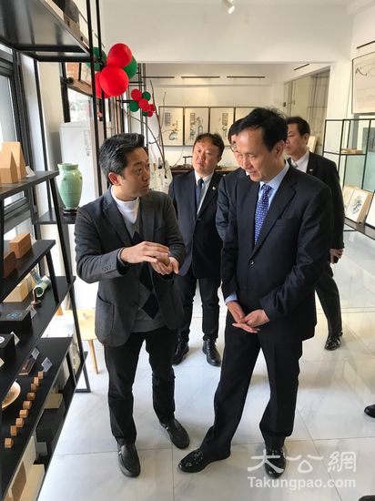 文创项目是朱立伦此次访沪参观的主题,今天一大早,他来到了位于上海西南面的麦可将文创园。创始于台北后迁至上海的麦可将,前身是台湾传统服装生产企业,在深耕上海二十多年后主动转型,依托原有老厂房为台湾文创团队在沪发展建立平台,成为两岸文化交流的桥梁和纽带,也是吸引台湾青年来沪创业就业的实践基地。在总经理连泰瑞的导览下,朱立伦一行饶有兴致地参观了其中的台湾文创小店,并浏览了不少特色文创产品。对于台湾青年的文创品牌能够在大陆受到欢迎,朱立伦表示这些都值得鼓励。
