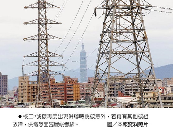 核二2号机再度出现并联时跳机意外,若再有其他机组故障,供电恐面临严峻考验。(图片来源:台湾《工商时报》)