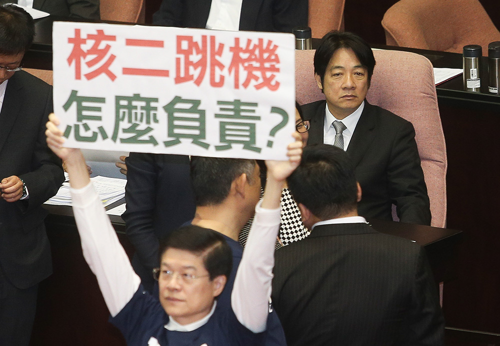 图:核二厂二号机跳机引发争论,国民党立委30日质疑民进党错误的能源政策,高喊“院长专案报告、民进党道歉”等口号。图后右为台“行政院长”赖清德 中央社