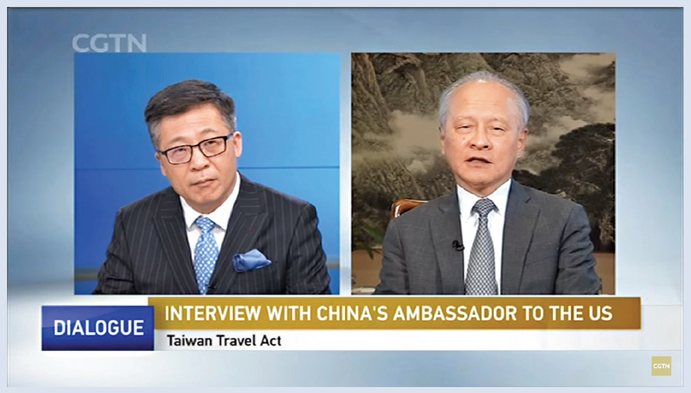 图:中国驻美大使崔天凯(右)四日接受中国国际电视台专访时表态,没有人能阻止中国统\\网络图片