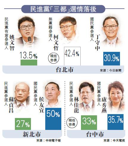根据中时媒体集团最新民调,国民党提名的侯友宜与民进党参选人苏贞昌对决,新北市民有50.6%会投给侯友宜,27.1%则支持苏贞昌,两人差距达23.5个百分点,显示蔡政府施政不佳已拖累民进党选情。而对年底台北市长选举,民进党仍卡在是否与现任台北市长柯文哲再合作的困境中,从过去的“礼让”变成“观望”。