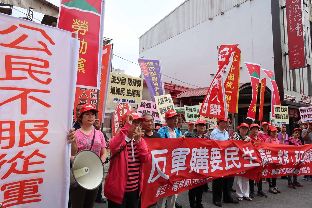 抗议团体包括劳动党、中国统一联盟和劳动人权协会及左翼联盟等,分据饭店两侧,高呼“拒绝举债购买军火”、“反军购要民生”、“两岸一家亲和平安全才有保障”、“要两岸和平,不要‘台独’战争”以及“美军滚出亚洲,维护亚太和平”等口号。为了防止过激行为,台当局出动大批警力在现场维护秩序。